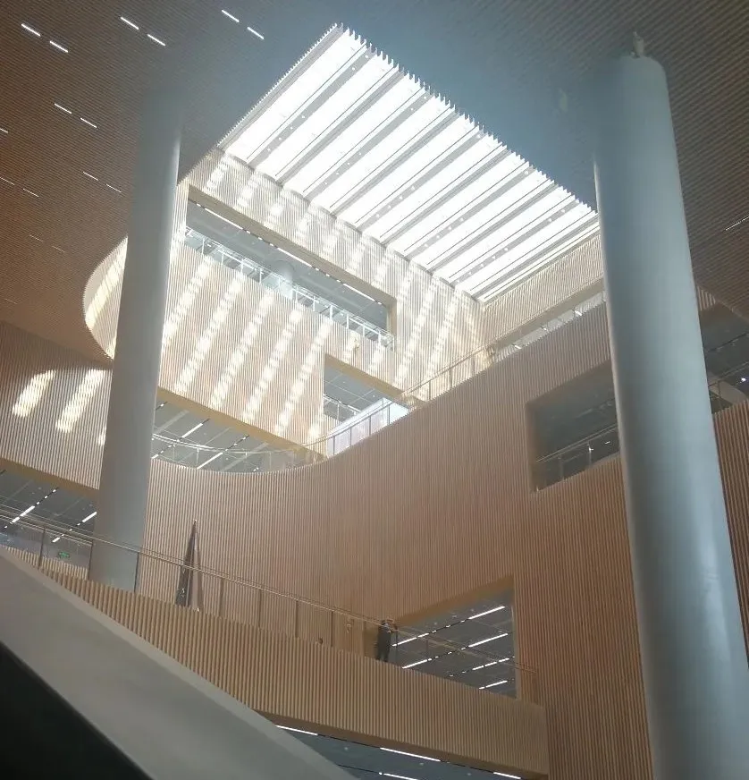 為融合室內(nèi)外自然環(huán)境,室內(nèi)四邊各設(shè)置了三層通高的邊庭,形成建筑形體上的四個(gè)大窗。天然光線經(jīng)過(guò)三玻兩腔雙銀玻璃的過(guò)濾,室內(nèi)光線柔和,為讀者創(chuàng)造適宜的光環(huán)境。室內(nèi)視野通透,讀者可俯瞰周邊世紀(jì)公園、城市綠化、城市街景等。建筑中央?yún)^(qū)域設(shè)置逐層螺旋上升的大型中庭,把天然光線引入室內(nèi)建筑核心區(qū)域,實(shí)現(xiàn)室內(nèi)豐富的空間。