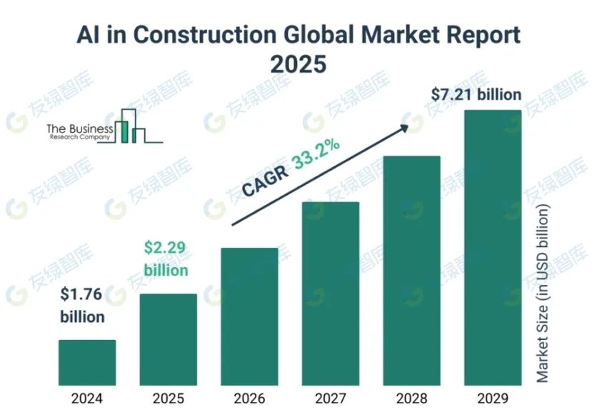 建筑市場中的 AI 正在迅速增長。預計到 2025 年將以 30.0% 的復合年增長率達到 22.9 億美元,到 2029 年將以 33.2% 的復合年增長率增長到 72.1 億美元。