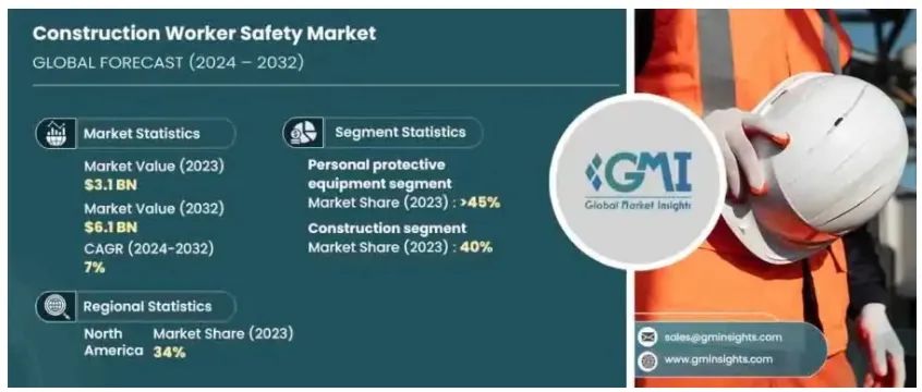 從建筑市場趨勢來看,2023 年工人安全市場價值 31 億美元,預計從 2024 年到 2032 年,在先進安全技術(shù)越來越多地采用的推動下,復合年增長率將超過 7%。