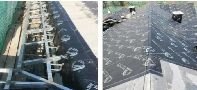 坡屋面壓光成活(左),刮涂BH2防水油膏