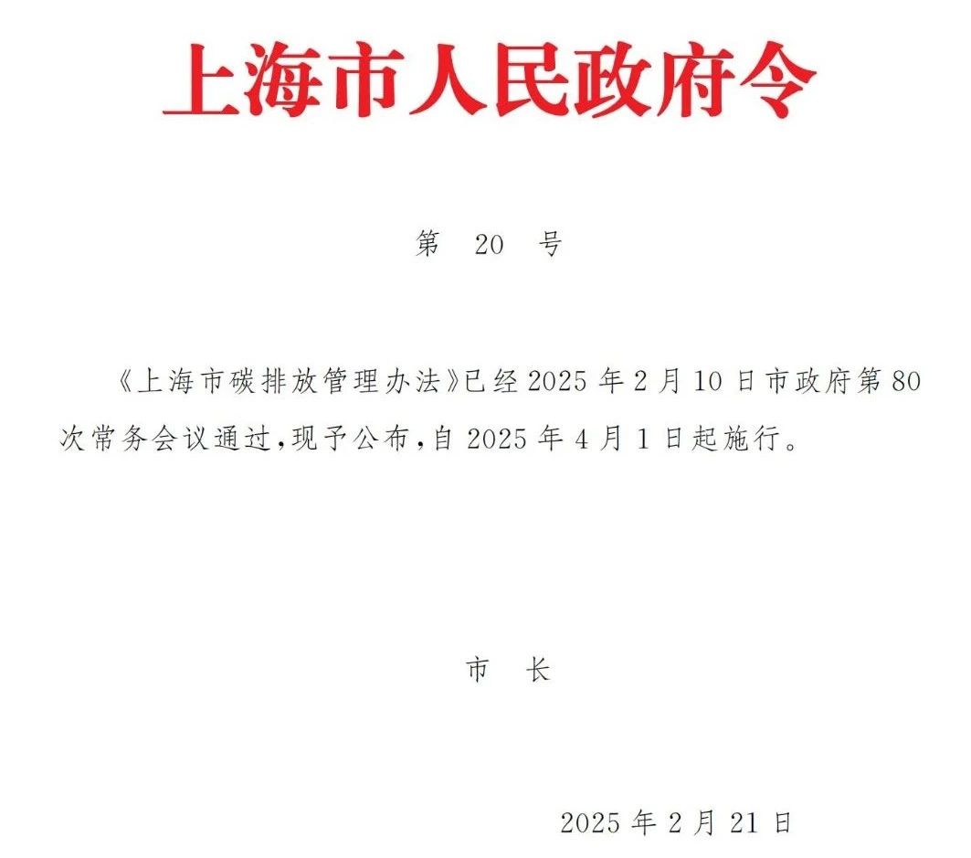 《上海市碳排放管理辦法》已經(jīng)2025年2月10日市政府第80次常務會議通過,現(xiàn)予公布,自2025年4月1日起施行。