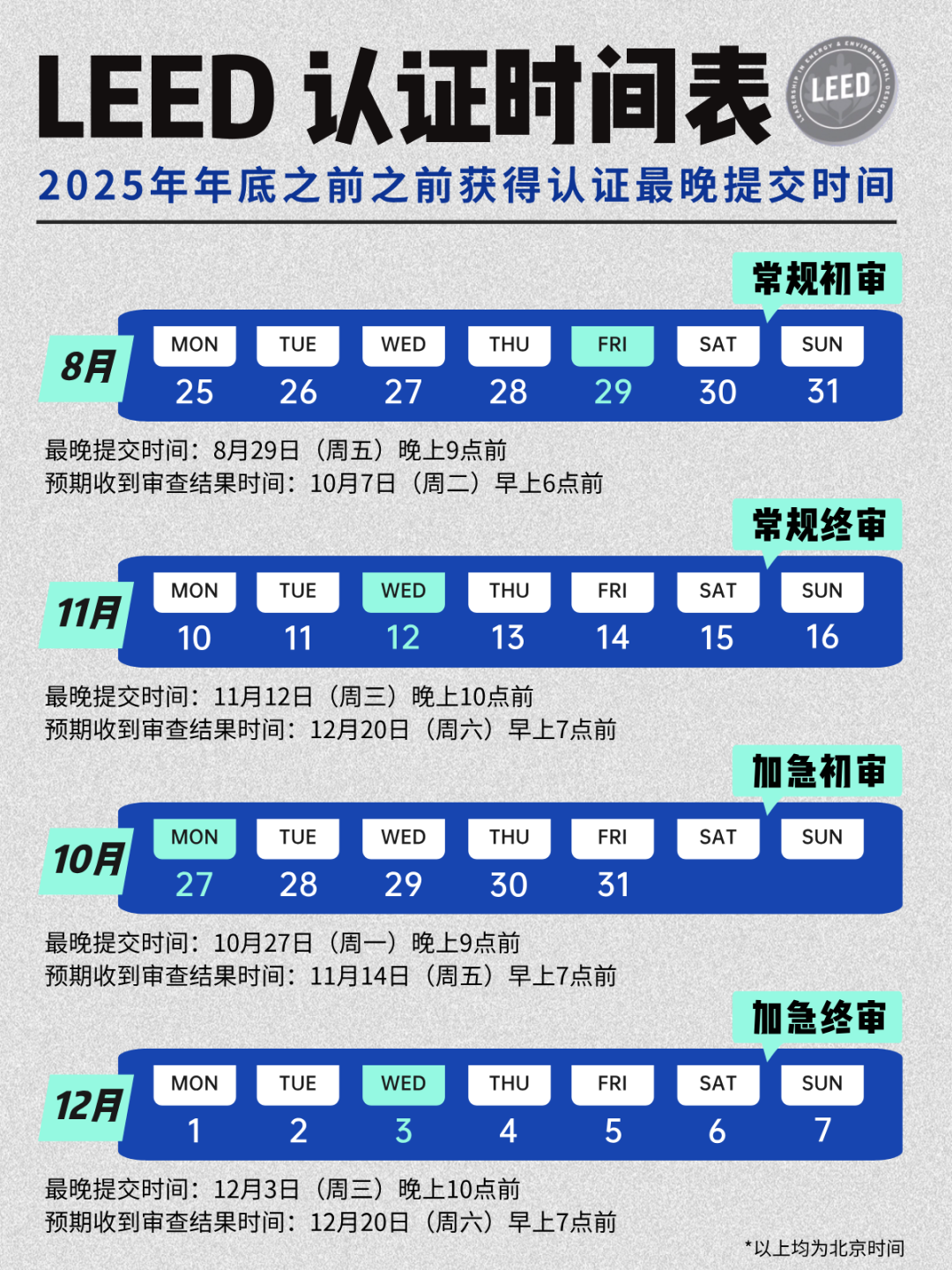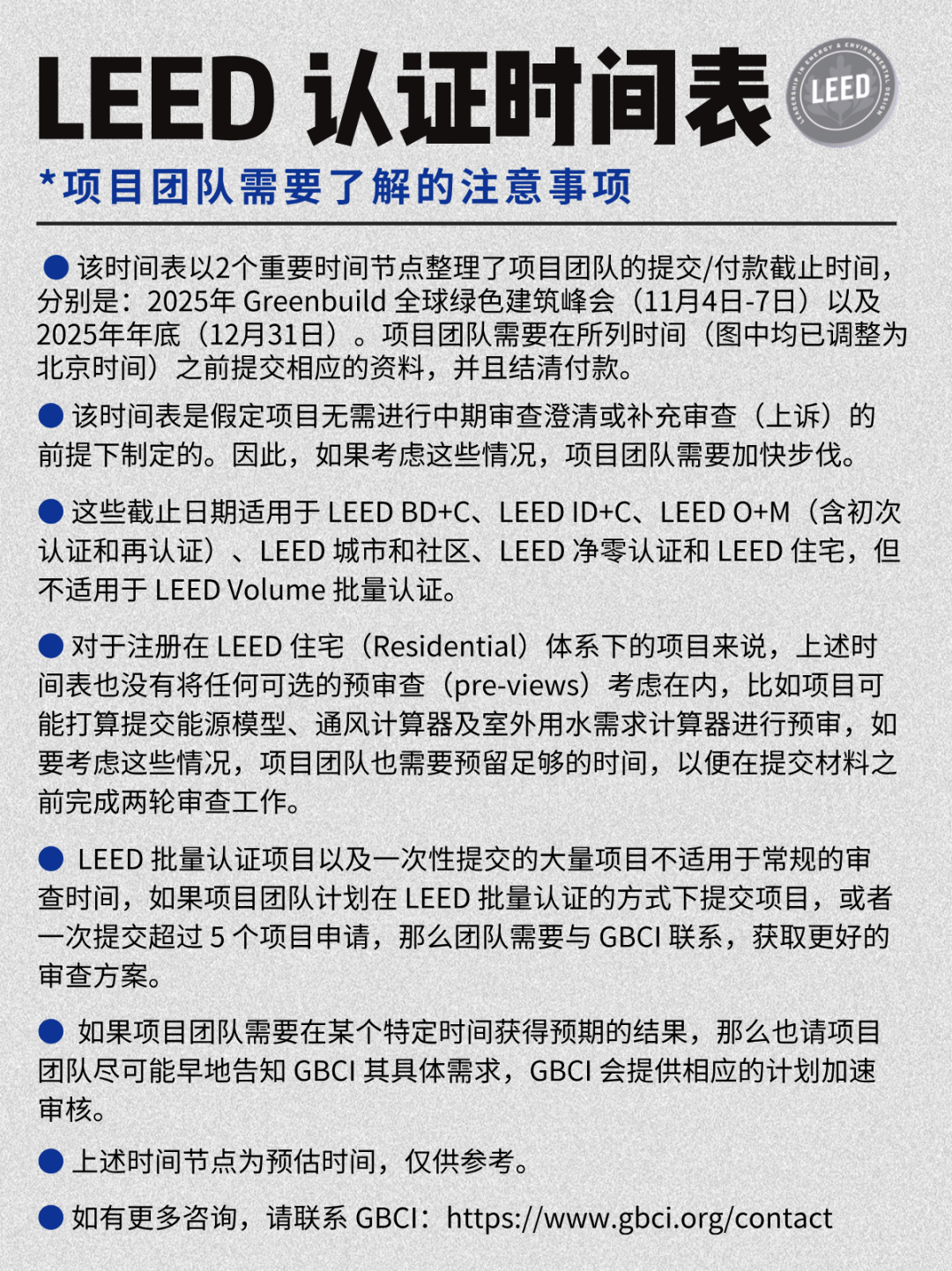 時間:2025-03-24 09:37:14 作者:GBWindows 來源:行業(yè)網(wǎng)站 閱讀:907內容摘要:近日,USGBC面向LEED項目團隊推出了一份新的時間表,旨在幫助有意向在2025年Greenbuild國際綠色建筑峰會(11月4-7日)之前、2025年底(12月31日)前獲得LEED正式認證的項目團隊了解對應的關鍵時間節(jié)點,確保項目能夠如期獲得認證。我們將這份時間表進行了整理,并調整為北京時間,方便項目團隊查看并保...近日,USGBC 面向 LEED 項目團隊推出了一份新的時間表,旨在幫助有意向在 2025 年 Greenbuild 國際綠色建筑峰會(11月4-7日)之前、2025 年底(12月31日)前獲得 LEED 正式認證的項目團隊了解對應的關鍵時間節(jié)點,確保項目能夠如期獲得認證。