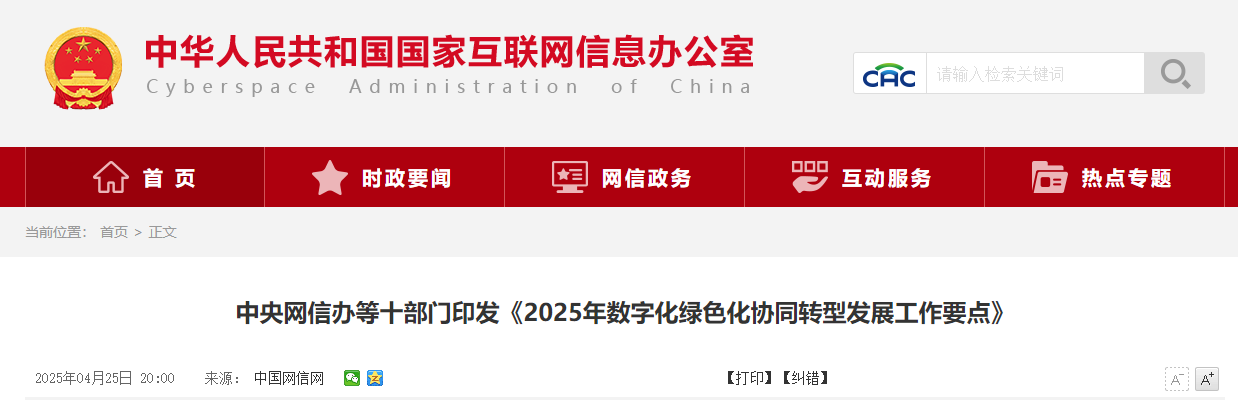 中央網(wǎng)信辦等十部門印發(fā)《2025年數(shù)字化綠色化協(xié)同轉(zhuǎn)型發(fā)展工作要點》