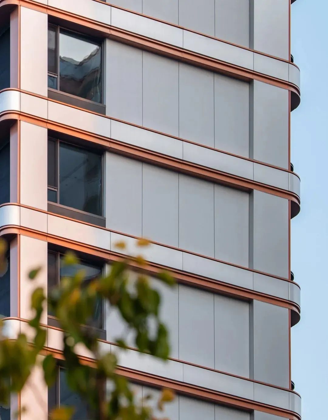 建筑立面主要采用香檳金鋁板與淺灰色水包水仿石涂料,局部多色澤處理增加立面趣味,材料的輕盈與結(jié)構(gòu)的自由流動相得益彰。光影之下,呈現(xiàn)出建筑的柔和立的特質(zhì)。