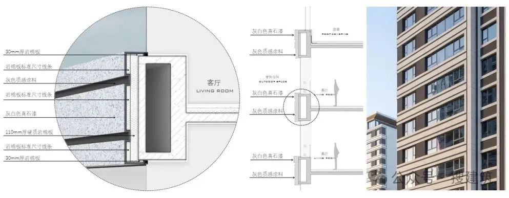通過不同涂料和不同線腳之間的組合,既能表達(dá)我們賦予建筑的現(xiàn)代化屬性,也呈現(xiàn)給居住者更為細(xì)膩的居住體驗。