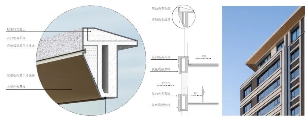 頂部的面層則是選用了輕質(zhì)的輕集料混凝土與灰白色真石漆的組合,搭配斜切立面的古銅色金屬漆,讓屋頂結(jié)構(gòu)更幾何、立體,視覺上更加輕盈,優(yōu)雅且靈動。
