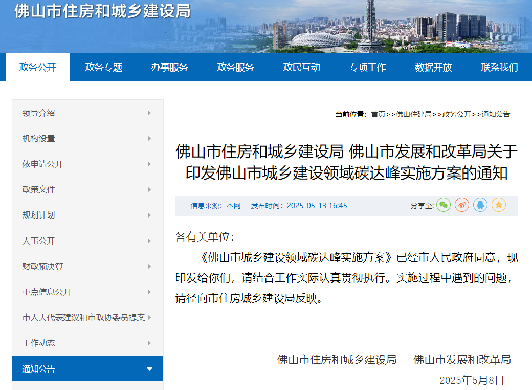 佛山市城鄉(xiāng)建設領域碳達峰實施方案
