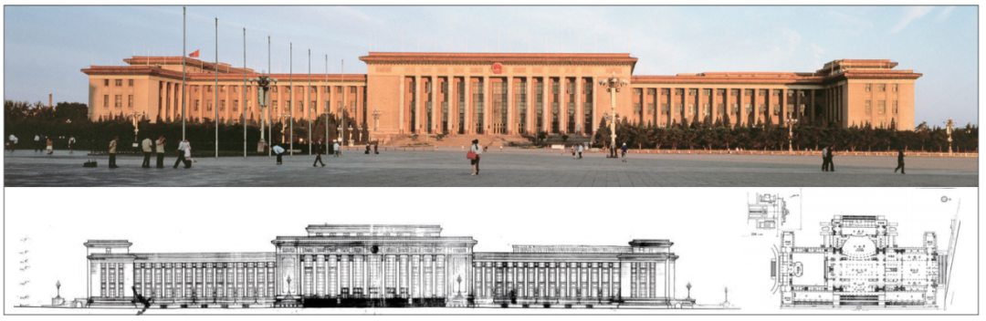 圖2 人民大會堂實景照片、東立面、一層平面圖(來源:上:楊超英 攝,下:《人民大會堂專輯》 建筑創(chuàng)作)