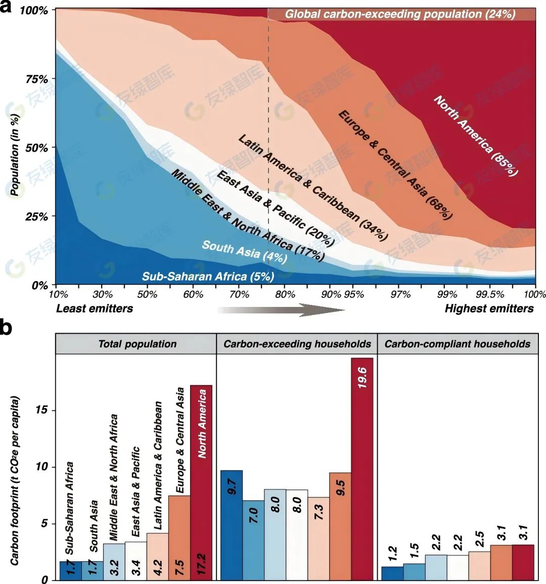 圖2顯示了不同地區(qū)碳足跡的差異。各地區(qū)碳超標(biāo)家庭的比例差異很大。北美的平均足跡最高(人均17.2噸二氧化碳當(dāng)量),其85.4%的人口超過(guò)了2020年全球目標(biāo)。像撒哈拉以南非洲這樣的足跡較低地區(qū)則顯示出顯著差異,其5.4%的人口擁有遠(yuǎn)高于其合規(guī)家庭的巨大足跡(人均9.7噸二氧化碳當(dāng)量)。
