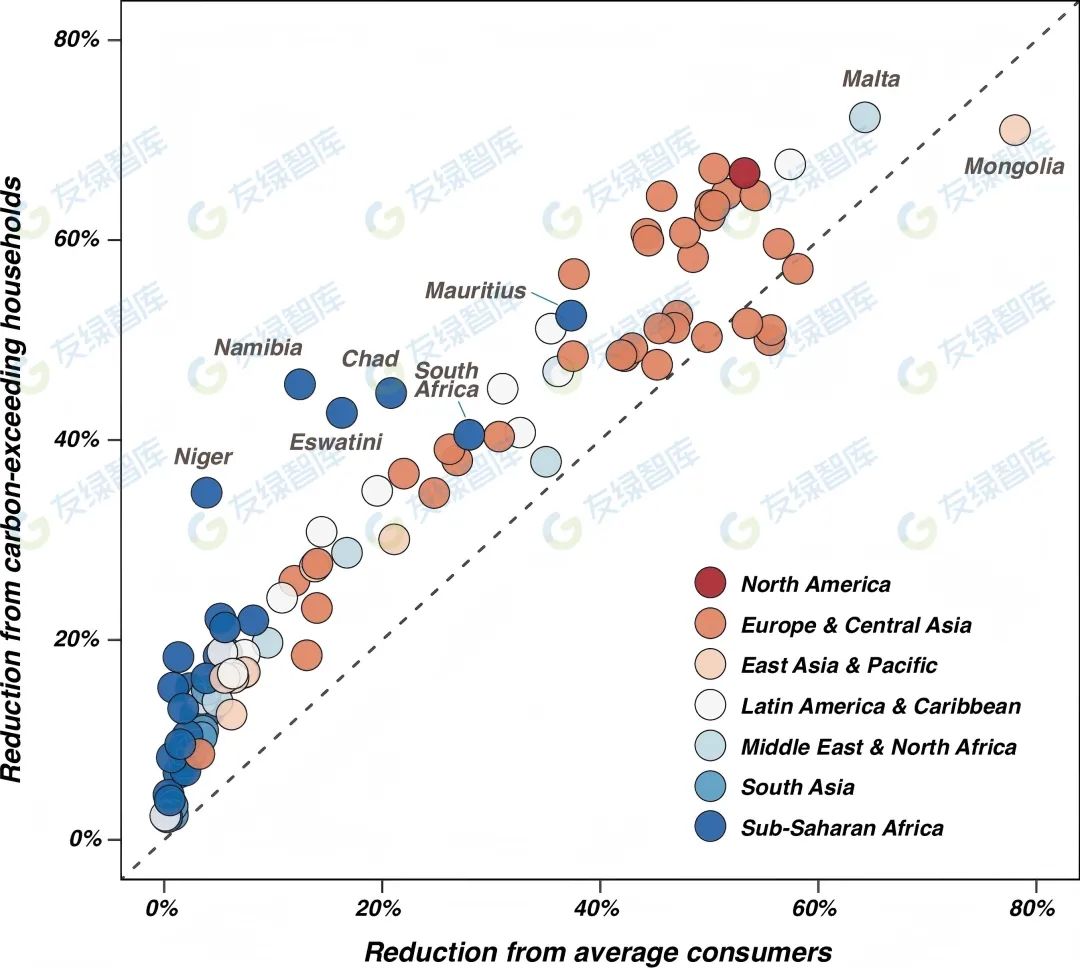圖6說(shuō)明了針對(duì)碳超標(biāo)家庭實(shí)施一套低碳支出措施所實(shí)現(xiàn)的碳減排,與文獻(xiàn)中常見(jiàn)做法(即在每個(gè)國(guó)家對(duì)相應(yīng)比例的“普通消費(fèi)者”應(yīng)用相同變化)所獲得的碳減排之間存在顯著偏差(范圍從-7%到33%)。這些偏差突顯了家庭消費(fèi)模式的異質(zhì)性,高排放家庭在減少其碳足跡方面展現(xiàn)出更高的潛力。在北美和歐洲國(guó)家,盡管減排潛力巨大,但觀察到的偏差相對(duì)較小。這主要?dú)w因于在這些富裕國(guó)家隨機(jī)選擇的普通消費(fèi)者中存在大量的碳超標(biāo)家庭。值得注意的是,一些撒哈拉以南非洲國(guó)家,如毛里求斯(本研究中減排52.5%)、納米比亞(45.6%)和乍得(44.7%),在以往的研究中常被忽視,卻顯示出相對(duì)較高的偏差。納米比亞的減排由食品、出行和服務(wù)支出的變化驅(qū)動(dòng),這歸因于其對(duì)旅游業(yè)的嚴(yán)重依賴(lài)。