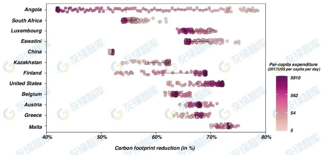 美國(guó)可以實(shí)現(xiàn)最大的絕對(duì)減排量(37億噸二氧化碳當(dāng)量),主要是通過(guò)出行和服務(wù)方面的支出變化(詳見(jiàn)補(bǔ)充圖2)。對(duì)于歐洲國(guó)家,一套以支出為重點(diǎn)的減緩措施可導(dǎo)致碳足跡顯著下降,特別是在盧森堡(67.2%)、丹麥(64.6%)和希臘(64.5%)。盧森堡顯示出巨大潛力,與其2017年的溫室氣體排放相比減少了950萬(wàn)噸二氧化碳當(dāng)量,這主要是由于其人口的很大一部分(99.7%是碳超標(biāo)家庭)廣泛參與了此類(lèi)需求側(cè)減緩。