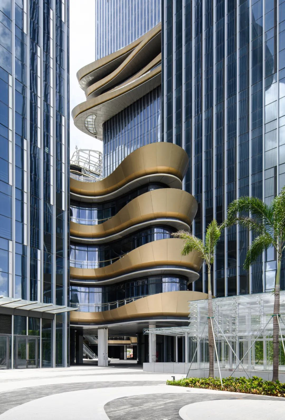 “天空之橋”的靈動(dòng)曲線由外立面香檳金色鋁板搭配銀色鋁板呈現(xiàn),為了抵御季候風(fēng)與臺(tái)風(fēng)的侵襲,橋底細(xì)節(jié)設(shè)置滑動(dòng)支座,確保橋體結(jié)構(gòu)的穩(wěn)定性。塔樓立面玻璃幕墻以豎向線條為主,表層為鋁制金屬格柵和裝飾條,玻璃幕墻使用Low-E中空玻璃,結(jié)合隱蔽式開(kāi)啟扇,營(yíng)造出如同雨中珠簾般的視覺(jué)效果,典雅而優(yōu)美。