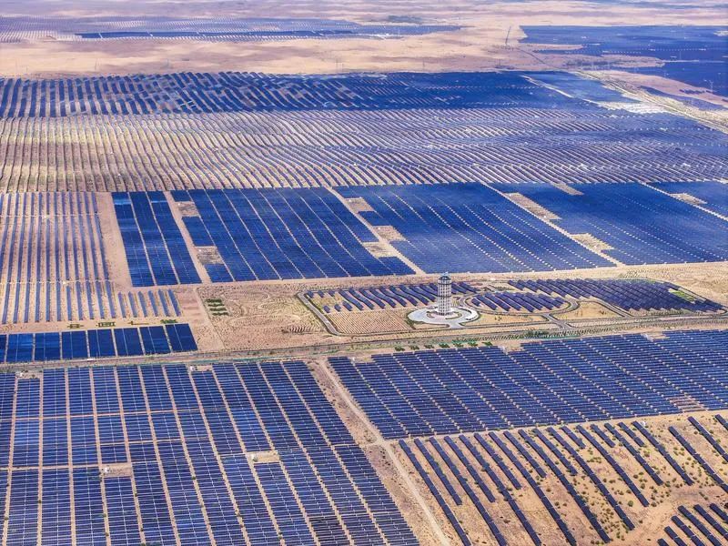 圖為位于內蒙古庫布其沙漠里的達拉特光伏發(fā)電應用領跑基地。新華社記者 連振 攝