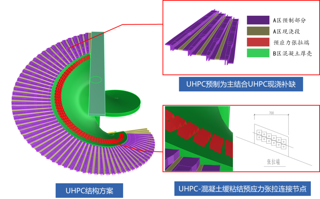 為此,研究團隊提出了以UHPC預(yù)制為主結(jié)合UHPC現(xiàn)澆補缺的結(jié)構(gòu)建造方法,提出并應(yīng)用了UHPC-混凝土緩粘結(jié)預(yù)應(yīng)力張拉連接節(jié)點及混凝土厚殼內(nèi)插鋼構(gòu)件互錨結(jié)構(gòu)體系,從理論上解決了UHPC結(jié)構(gòu)實施的可行性問題。