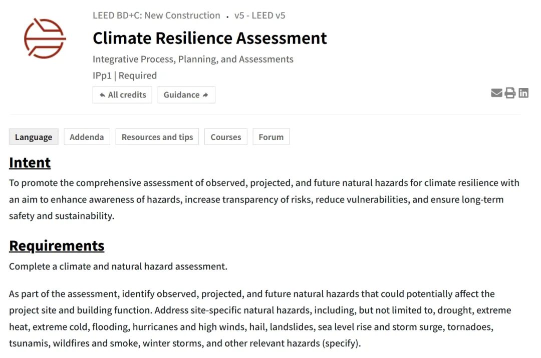 在 LEED v5 中,所有項目必須完成新的先決條件:“氣候韌性評估(Climate Resilience Assessment)”。