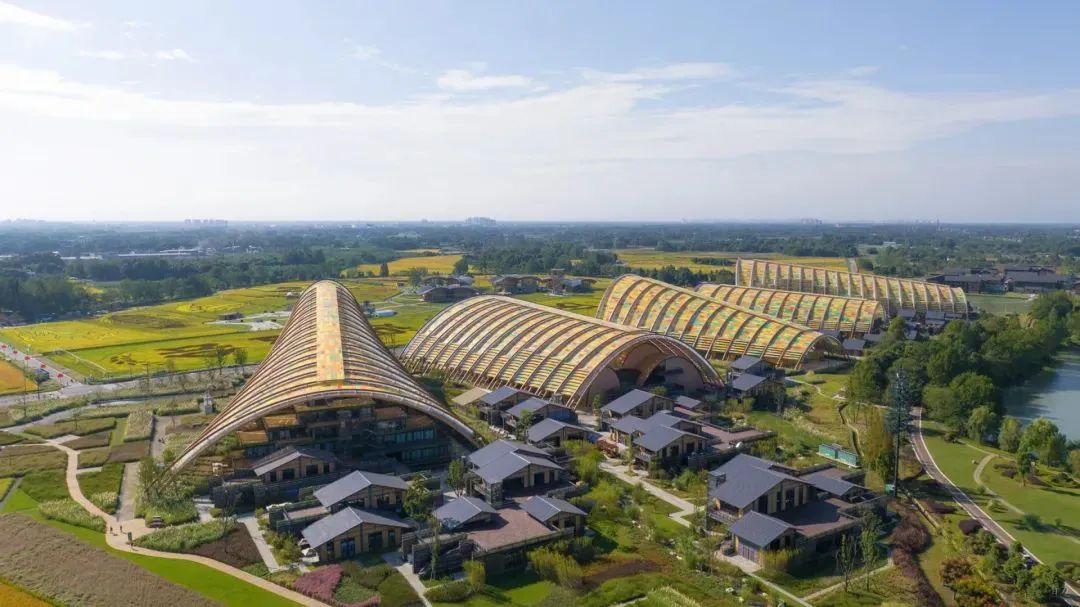 2021年建成的成都天府農(nóng)博園項目,地處美麗的田園景觀中。該項目設(shè)計摒棄傳統(tǒng)工業(yè)展館和商業(yè)會展中心的做法,針對農(nóng)產(chǎn)品銷售展賣,打造類似農(nóng)業(yè)大棚、集市的新型建造體系。