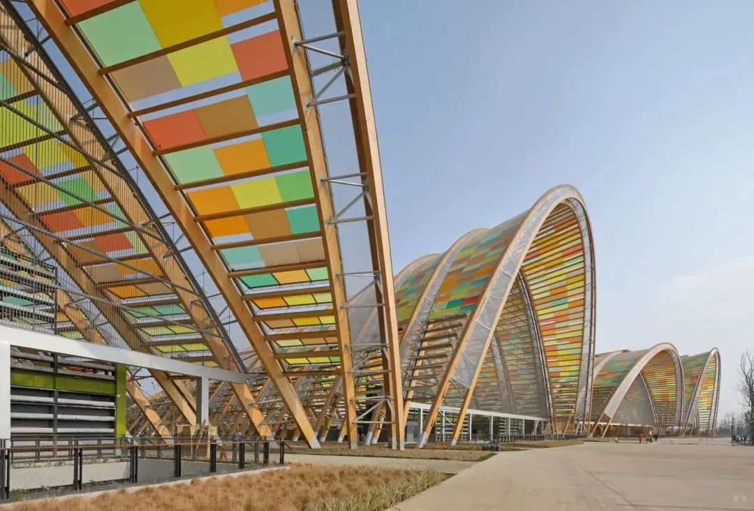 該體系不僅滿足農(nóng)博會需求,還為成都增添了在田園中開會的新場景。建筑包含會議廳、博物館、辦公樓等場景,主體結(jié)構(gòu)為木結(jié)構(gòu),少量采用鋼節(jié)點和鋼桁架;建筑內(nèi)部因公共空間功能和防火要求采用鋼結(jié)構(gòu),空間木結(jié)構(gòu)開放,采光良好。建筑最大跨度達(dá)117米,單拱高度達(dá)42米,成為目前世界上最大的木結(jié)構(gòu)案例之一,并榮獲多項國際結(jié)構(gòu)大獎。