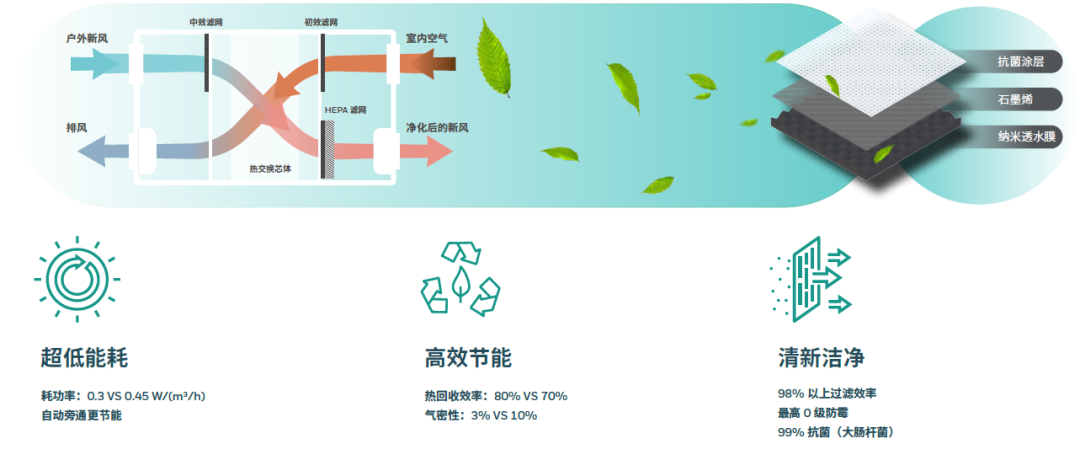 室內(nèi)精裝系統(tǒng)選用霍尼韋爾ERV高效熱回收新風(fēng)系統(tǒng),集空氣置換、新風(fēng)凈化、能量回收于一體,將室外新鮮空氣經(jīng)過(guò)高效過(guò)濾凈化后輸入室內(nèi),排風(fēng)和送風(fēng)通過(guò)高效熱回收芯體進(jìn)行能量交換,對(duì)排風(fēng)中的冷熱量進(jìn)行回收利用,以對(duì)室外新風(fēng)進(jìn)行預(yù)冷或預(yù)熱,有效降低室外新風(fēng)帶來(lái)的建筑冷熱負(fù)荷需求。