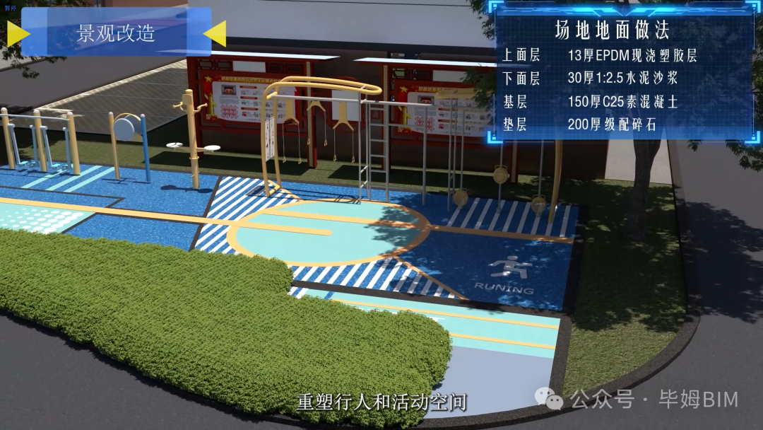景觀改造沉浸式推演:通過BIM+GIS融合技術(shù),模擬中心噴泉循環(huán)系統(tǒng)水力路徑、硅PU籃球場(chǎng)排水坡度及透水游步道(15cm碎石+15cm透水混凝土)生態(tài)效益,確保功能與美學(xué)統(tǒng)一。