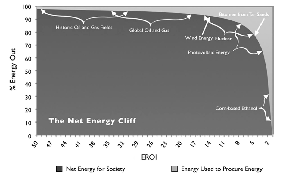 一個EROI為100:1的系統(tǒng),意味著99%的產(chǎn)出是凈能量;而一個EROI為5:1的系統(tǒng),凈能量比例已降至80%;到了3:1,凈能量只剩下67%。