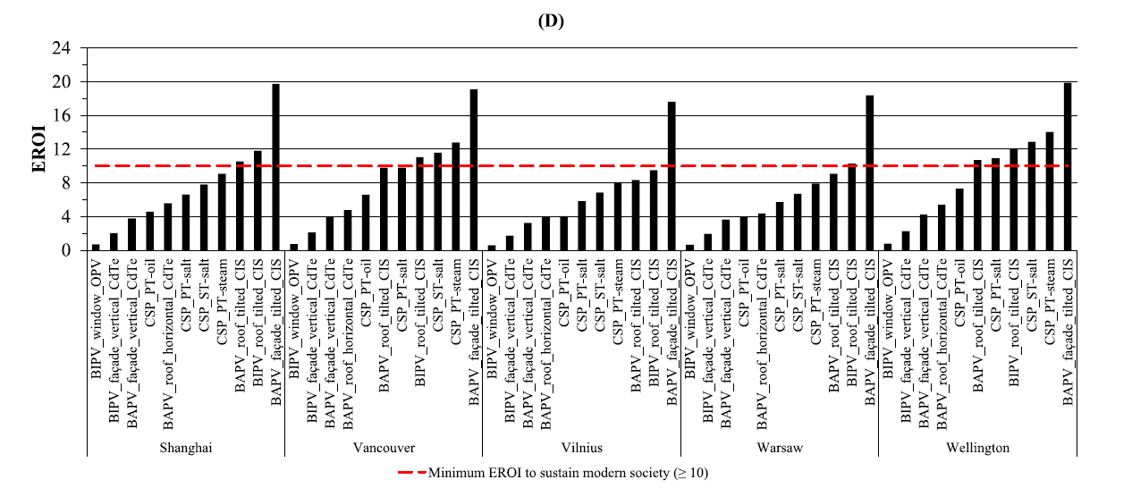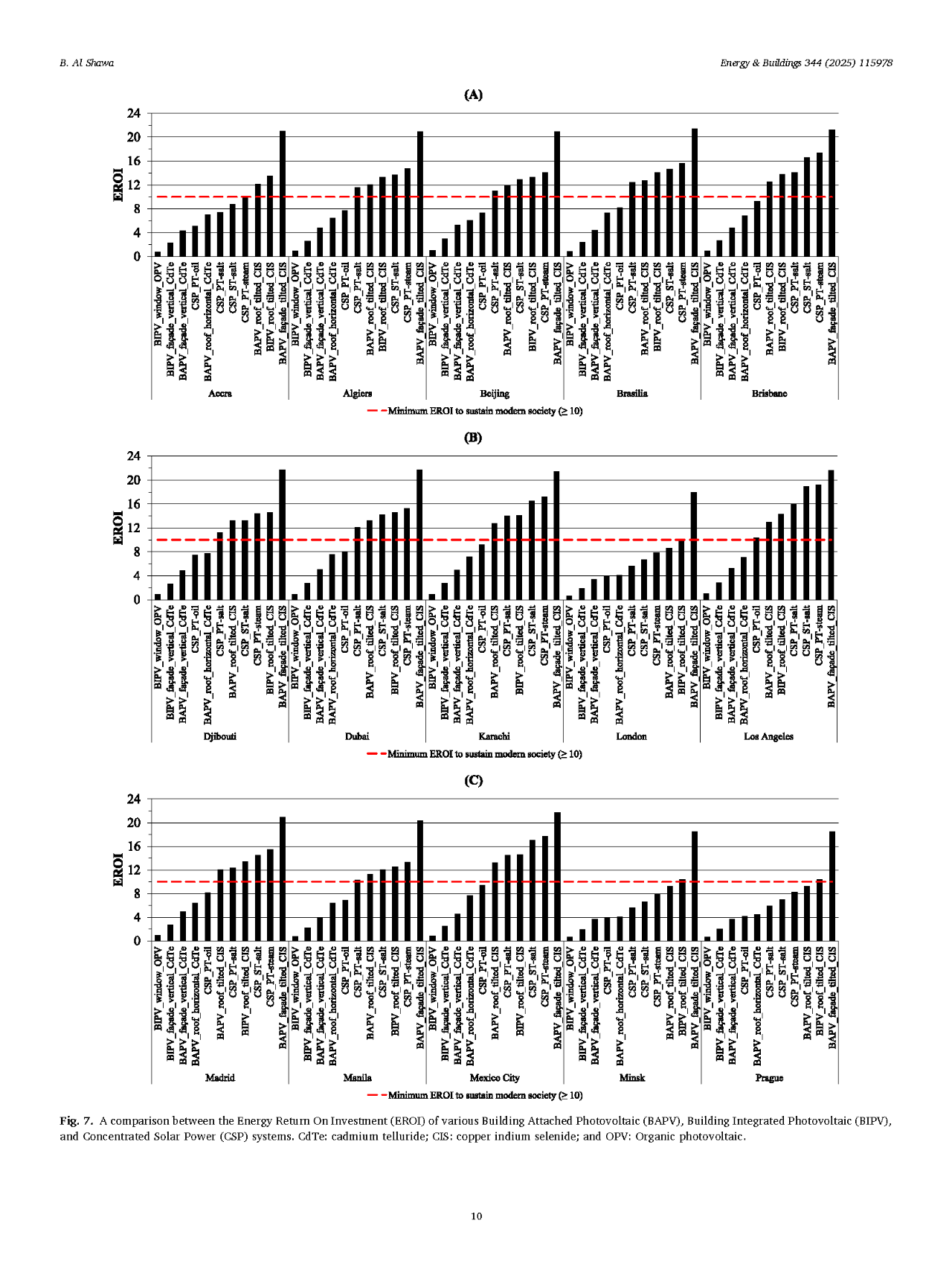 對全球 20 個城市的分析表明,垂直安裝的 BAPV/BIPV 表現(xiàn)最差,而最優(yōu)傾斜角度的光伏系統(tǒng)和 CSP 系統(tǒng)表現(xiàn)最佳。最差與最佳系統(tǒng)的 EROI 差異達 20.3–30.0 倍。這一結(jié)果對政策制定者和建筑設(shè)計師具有重要意義:應(yīng)優(yōu)先投資高 EROI 技術(shù),遵循 “可再生能源生產(chǎn)層級”,僅在無法安裝最優(yōu)系統(tǒng)時才考慮次優(yōu)選擇。