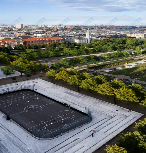 凱倫·布利克森斯廣場(chǎng) (Karen Blixens Square) 的港口對(duì)面是歷史悠久的恩加維公園 (Enghave Park),占地約 11 英畝,分為草坪、花園、游樂(lè)場(chǎng)和球場(chǎng)。公園花了三年時(shí)間重新設(shè)計(jì)和物理降低,現(xiàn)在包括一個(gè)容量接近 600 萬(wàn)加侖的綜合地下水庫(kù)?;炷翐跬翂⒂晁龑?dǎo)到公園內(nèi),并額外增加了 370 萬(wàn)加侖的儲(chǔ)水能力。當(dāng)墻壁不用于防洪時(shí),公園游客可以坐在上面。