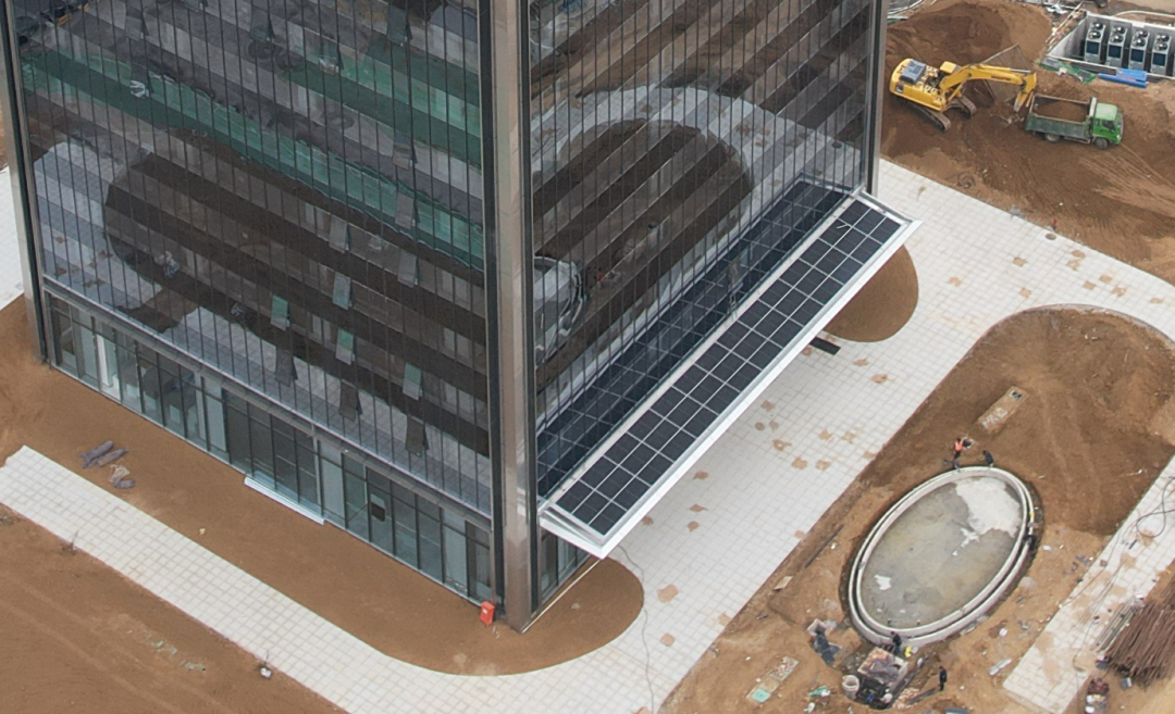 南立面裙樓雨棚的黑色晶硅組件與塔冠遙相呼應(yīng),組件的傾斜角度經(jīng)過(guò)精心設(shè)計(jì),既保障排水順暢,又有效減少了積灰對(duì)外觀和發(fā)電效率的影響。