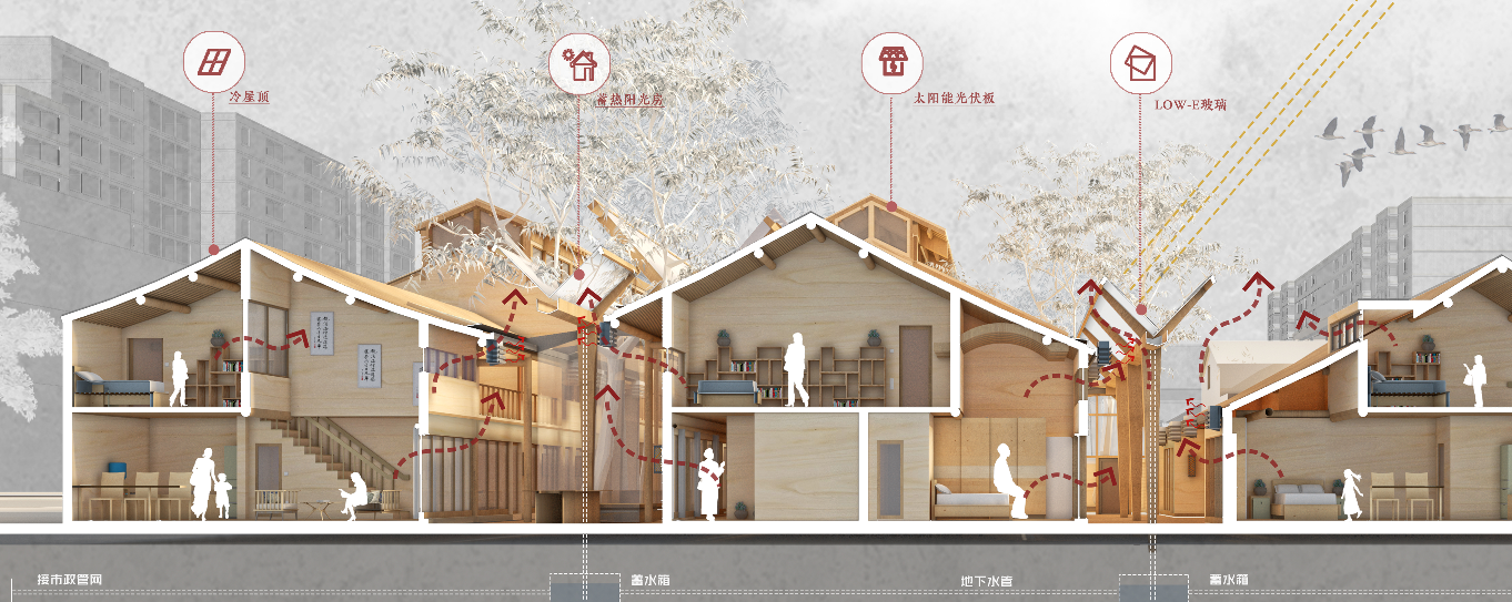 空調(diào)外機只是綠色建筑宏大敘事里的一個逗號,建筑熱管理散落于建筑的每一寸肌理:光伏、屋頂、幕墻、設(shè)備……任何單一技術(shù)都容易陷入“按下葫蘆浮起瓢”的窘境,只有讓多技術(shù)策略精準(zhǔn)協(xié)同,才能觸發(fā)“1+1>2”的綠色增益效應(yīng)。在第二屆綠色建筑建筑設(shè)計競賽一等獎的作品《Y-HOUSE——讓庭院隨自然呼吸的木構(gòu)探索》中,把人頭頂高度的外機排熱當(dāng)作設(shè)計起點:低碳木構(gòu)為骨架,可變遮陽為皮膚,空調(diào)遮擋構(gòu)件為“導(dǎo)流片”,再把庭院通風(fēng)系統(tǒng)嵌入其中,熱脅迫感被削去,通過在有機更新中顯著提升了空間舒適性與生態(tài)效益。