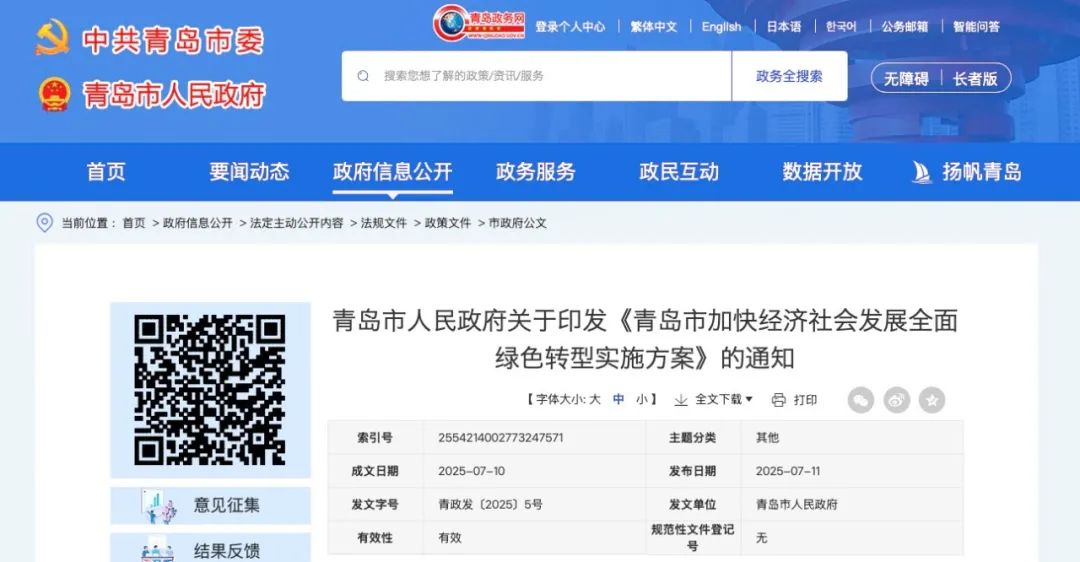 2025年7月10日,青島市人民政府印發(fā)《青島市加快經(jīng)濟社會發(fā)展全面綠色轉(zhuǎn)型實施方案》。