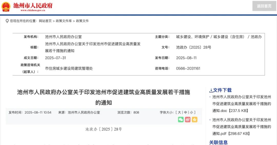 2025年7月31日,池州市人民政府辦公室印發(fā)《池州市促進建筑業(yè)高質(zhì)量發(fā)展若干措施》。