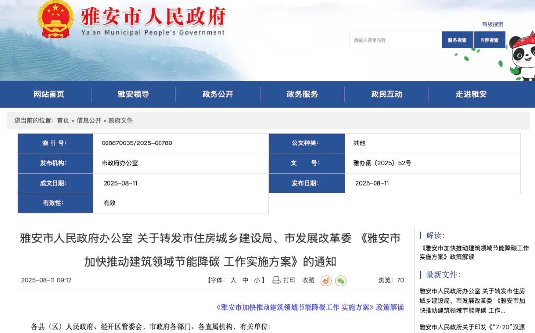 2025年7月24日,雅安市人民政府辦公室轉(zhuǎn)發(fā)市住房城鄉(xiāng)建設(shè)局、市發(fā)展改革委《雅安市加快推動建筑領(lǐng)域節(jié)能降碳工作實施方案》。
