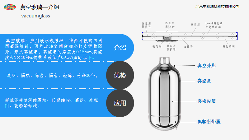 2、真空玻璃——應(yīng)用暖水瓶原理,其保溫、隔熱、隔聲能力相當(dāng)于50cm厚的保溫墻體,阻斷室內(nèi)能源的流失,保持恒溫,減少能耗。