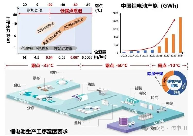 在寧德時(shí)代的鋰電車(chē)間,這項(xiàng)技術(shù)每天都在創(chuàng)造“干燥奇跡”。這里的空氣露點(diǎn)被控制在-20℃以下——而-60℃露點(diǎn)下濕度意味著每公斤空氣中的水分不到0.01克,此時(shí)沙漠環(huán)境的濕度已經(jīng)是它的1000倍。這樣極致的干燥,靠傳統(tǒng)空調(diào)根本做不到,過(guò)去只能依賴(lài)瑞典、美國(guó)、日本等國(guó)家的進(jìn)口除濕設(shè)備,不僅價(jià)格昂貴,還無(wú)法擺脫對(duì)外技術(shù)依賴(lài)。