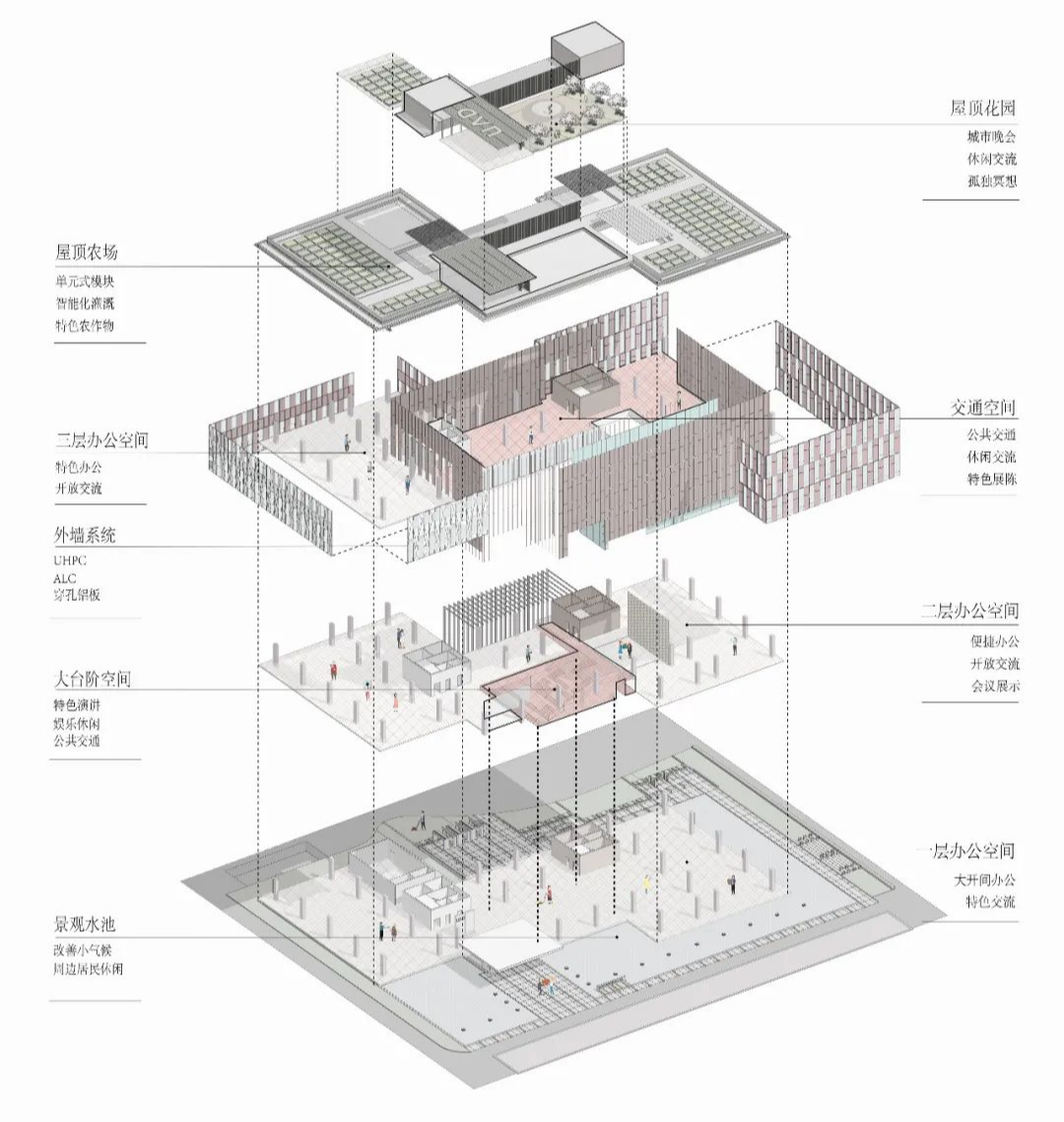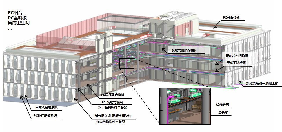 (2)圍護墻采用自研的UHPC外掛墻板系統(tǒng)+單元式幕墻系統(tǒng),滿足外墻保溫、隔熱、裝飾一體化;內(nèi)隔墻采用裝配式內(nèi)墻系統(tǒng),采用ALC條板集合成品玻璃隔斷,去除抹灰粉刷層,滿足內(nèi)墻與管線、裝飾一體化;