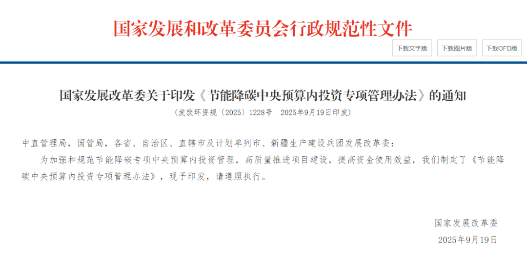2025年10月20日 18:222025年9月,國家發(fā)改委制定了《節(jié)能降碳中央預算內(nèi)投資專項管理辦法》,本專項支持低碳零碳負碳示范項目,項目支持比例為核定總投資的 20%。本辦法從印發(fā)之日起施行,有效期 5 年,根據(jù)情況適時修訂調整?!豆?jié)能降碳中央預算內(nèi)投資專項管理辦法》(發(fā)改環(huán)資規(guī)〔2024〕338 號)同時廢止。