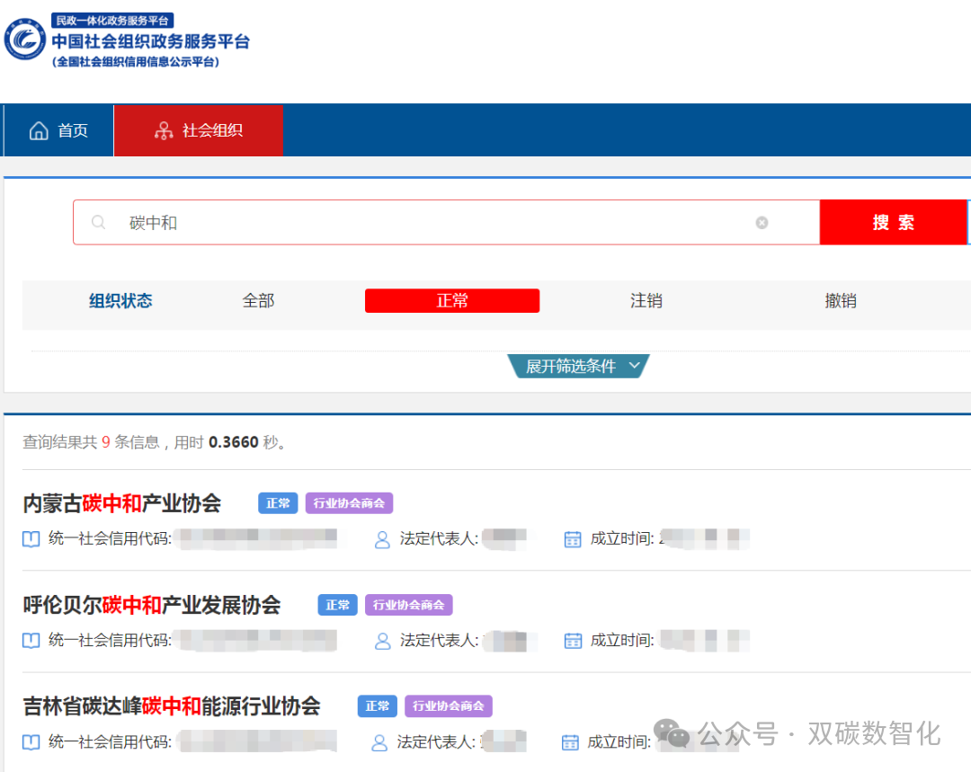 檢索“雙碳”、“綠色低碳”、“碳中和”、“碳達峰”、“節(jié)能降碳”等關鍵詞。以“碳中和”為例,查詢結果如下圖,均為省級或者地市級的行業(yè)協(xié)會,暫未發(fā)現(xiàn)有中國、全國等開頭的行業(yè)協(xié)會。