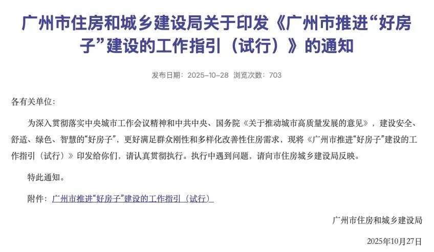 2025年10月27日,廣州市住房和城鄉(xiāng)建設(shè)局印發(fā)《廣州市推進(jìn)“好房子”建設(shè)的工作指引(試行)》。