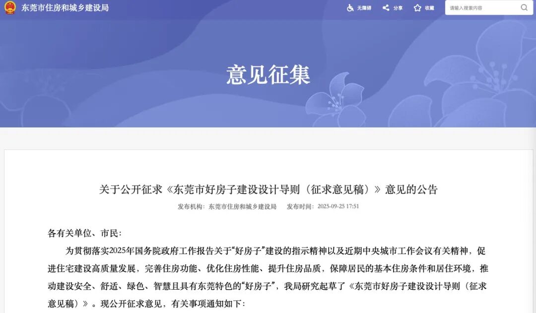 2025年9月25日,東莞市住房和城鄉(xiāng)建設(shè)局發(fā)布《東莞市好房子建設(shè)設(shè)計(jì)導(dǎo)則(征求意見(jiàn)稿)》,向社會(huì)公開(kāi)征集意見(jiàn)。