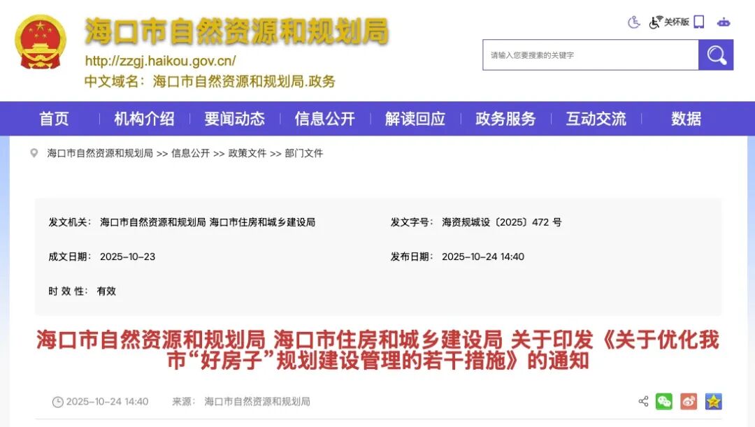 2025年10月23日,??谑凶匀毁Y源和規(guī)劃局、??谑凶》亢统青l(xiāng)建設(shè)局印發(fā)《關(guān)于優(yōu)化我市“好房子”規(guī)劃建設(shè)管理的若干措施》。