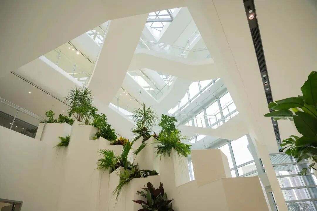 在示范樓設(shè)計(jì)階段,上海建工園林集團(tuán)就以“健康建筑三星標(biāo)準(zhǔn)”的指標(biāo)要求。其中,可開(kāi)啟幕墻、采光中庭以及地下車(chē)庫(kù)的導(dǎo)光管系統(tǒng)等設(shè)置,最大限度地引入自然風(fēng)與自然光。智能照明系統(tǒng)動(dòng)態(tài)調(diào)節(jié)室內(nèi)光線(xiàn)色溫,模擬自然節(jié)律,有效避免了人工光環(huán)境帶來(lái)的視覺(jué)疲勞。嚴(yán)選綠色建材確保“零甲醛”,室內(nèi)PM2.5年均濃度19μg/m3,切實(shí)保障使用者的身體健康,同時(shí),提供健身房與員工食堂,采用中庭環(huán)繞式樓梯串聯(lián)各樓層,鼓勵(lì)健康行為。