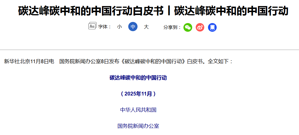 11月8日,國務(wù)院新聞辦公室發(fā)布了《碳達(dá)峰碳中和的中國行動》白皮書,白皮書顯示,中國重點(diǎn)領(lǐng)域低碳發(fā)展深入推進(jìn)。中國把碳達(dá)峰碳中和納入經(jīng)濟(jì)社會發(fā)展全局,加快構(gòu)建綠色低碳生產(chǎn)方式、生活方式,為高質(zhì)量發(fā)展注入澎湃綠色動能。