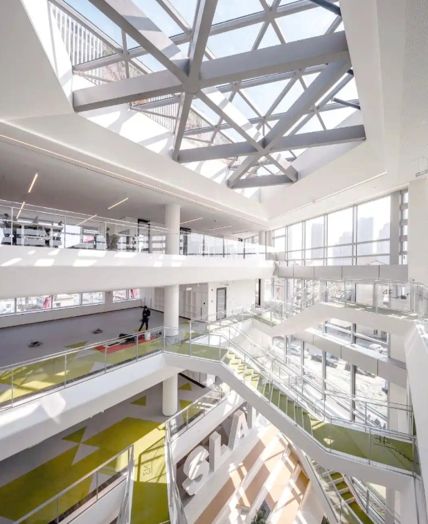 該建筑外窗和幕墻采用透光性良好的材質(zhì)、控制房間進(jìn)深,并利用中庭導(dǎo)入陽(yáng)光,使室內(nèi)形成良好的雙側(cè)自然采光效果,地下空間則通過(guò)導(dǎo)光管系統(tǒng)引入自然光線(xiàn),滿(mǎn)足人員舒適度的同時(shí)減少照明能耗;同時(shí)建筑采用智慧照明系統(tǒng),進(jìn)一步減少能耗。建筑外立面采用五玻雙腔玻璃的被動(dòng)式節(jié)能幕墻,均勻設(shè)置開(kāi)啟幕墻,室內(nèi)幾乎全空間可實(shí)現(xiàn)自然通風(fēng)換氣次數(shù)不小于每小時(shí)2次,有效減少空調(diào)設(shè)施耗能。