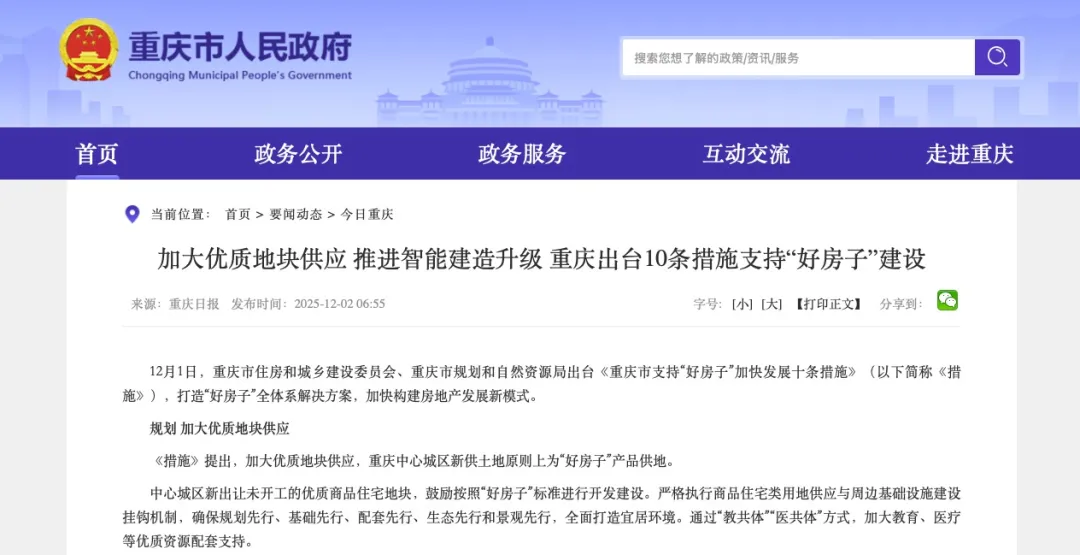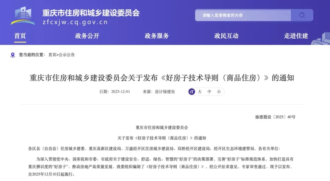 2025年12月1日,重慶市住房和城鄉(xiāng)建設(shè)委員會(huì)發(fā)布《好房子技術(shù)導(dǎo)則(商品住房)》。