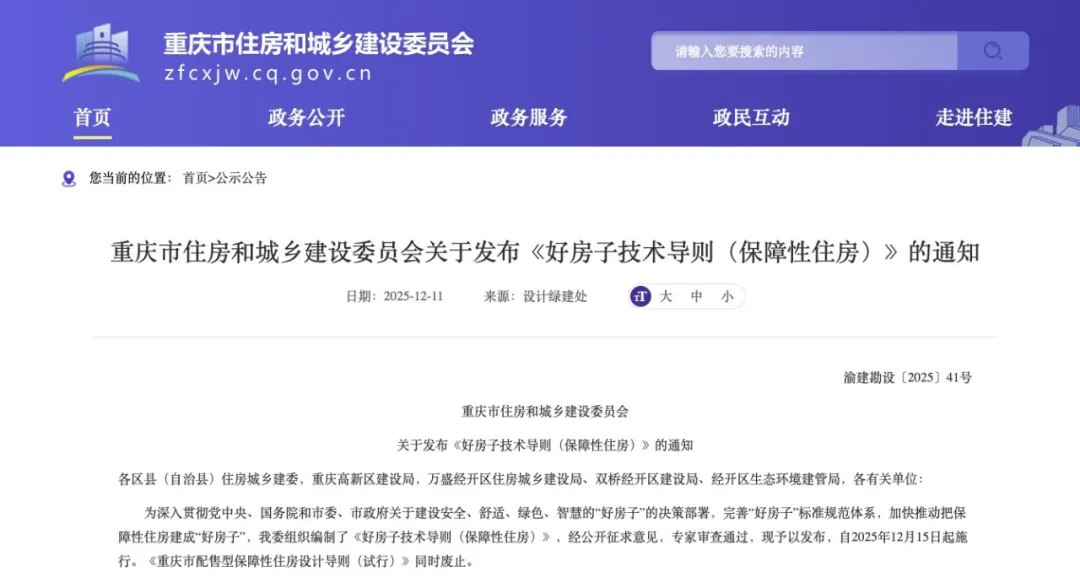 2025年12月10日,重慶市住房和城鄉(xiāng)建設(shè)委員會(huì)發(fā)布《好房子技術(shù)導(dǎo)則(保障性住房)》。