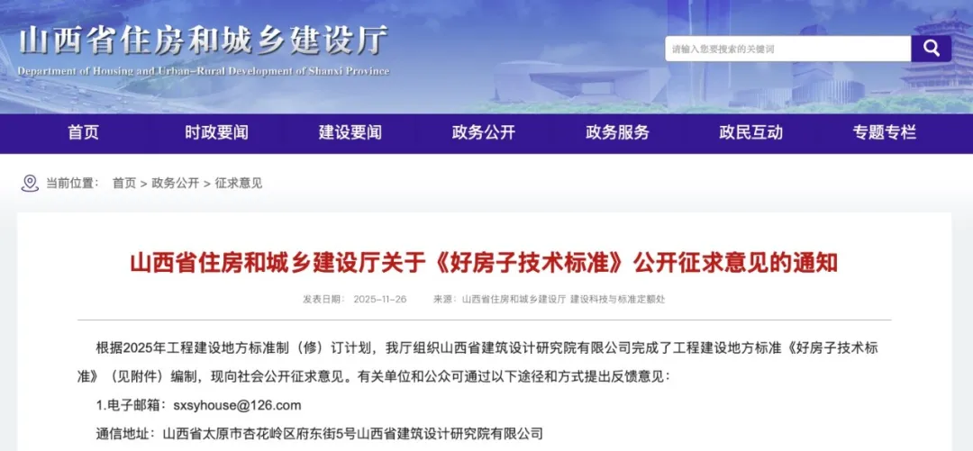 山西省 2025年11月26日,山西省住房和城鄉(xiāng)建設(shè)廳發(fā)布工程建設(shè)地方標(biāo)準(zhǔn)《好房子技術(shù)標(biāo)準(zhǔn)(征求意見(jiàn)稿)》。
