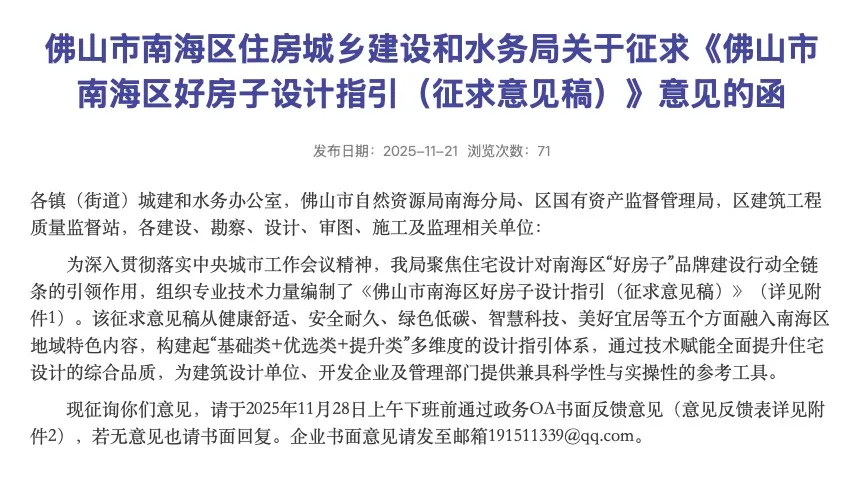 佛山市南海區(qū) 2025年11月20日,佛山市南海區(qū)住房城鄉(xiāng)建設(shè)和水務(wù)局發(fā)布《佛山市南海區(qū)好房子設(shè)計(jì)指引(征求意見(jiàn)稿)》。