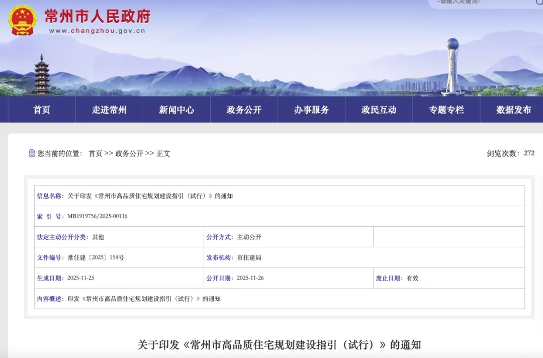 常州市 2025年11月25日,常州市住房和城鄉(xiāng)建設(shè)局、常州市自然資源和規(guī)劃局印發(fā)《常州市高品質(zhì)住宅規(guī)劃建設(shè)指引(試行)》。