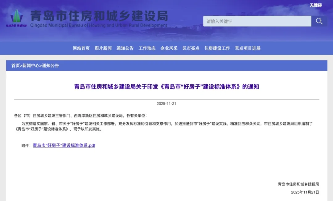 青島市 2025年11月21日,青島市住房和城鄉(xiāng)建設(shè)局印發(fā)《青島市“好房子”建設(shè)標(biāo)準(zhǔn)體系》,《標(biāo)準(zhǔn)體系》從住宅全生命周期和功能性能兩個(gè)維度,為“好房子”建設(shè)搭建起基礎(chǔ)性標(biāo)準(zhǔn)體系框架,旨在通過(guò)系統(tǒng)性、科學(xué)化的技術(shù)規(guī)范與政策引導(dǎo),推動(dòng)全市住房建設(shè)向更高品質(zhì)邁進(jìn)。