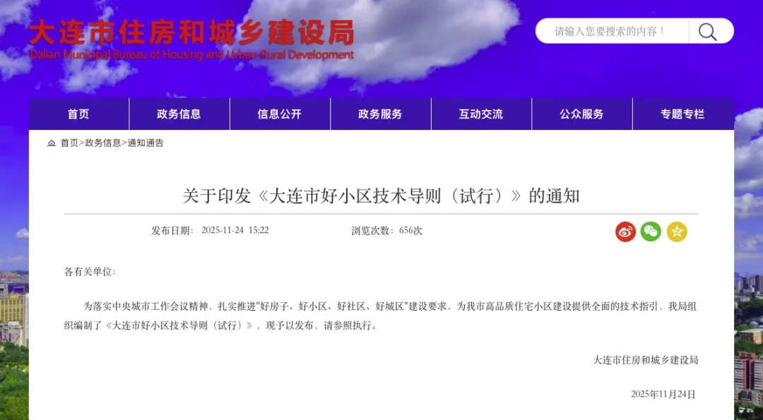大連市 2025年11月24日,大連市住房和城鄉(xiāng)建設(shè)局印發(fā)《大連市好小區(qū)技術(shù)導(dǎo)則(試行)》。
