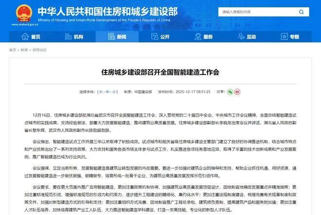 2025年12月,住建部聯(lián)合國(guó)家發(fā)改委、工信部等13個(gè)部門(mén)印發(fā)《關(guān)于全面推進(jìn)智能建造發(fā)展的指導(dǎo)意見(jiàn)》,明確2026年為智能建造全面推廣元年。